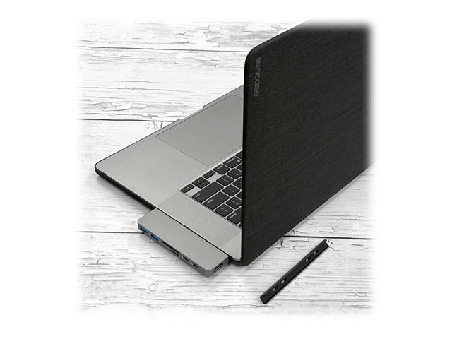 Hub USB-C de forme adaptée avec HDMI 4K 60Hz et poignée magnétique pour MacBook Pro et MacBook Air. Cette station d'accueil USB-C se fixe en toute sécurité au MacBook en ajoutant 7 ports : Sortie HDMI 4K 60Hz, USB-C PD, compatible Thunderbolt 3, et plus encore.
