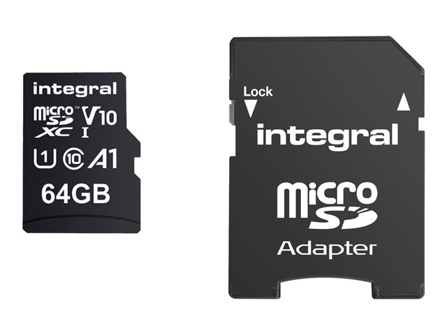 Description du produit Integral - carte mémoire flash - 64 Go - microSDXC UHS-I Type du Produit Carte mémoire flash Format Carte mémoire microSDXC UHS-I Capacité de stockage 64 Go Indice de vitesse A1 / Video Class V10 / UHS Class 1 / Class10 Adaptateur mémoire fourni Adaptateur microSDXC vers SD Garantie du fabricant Garantie de 5 ans -
