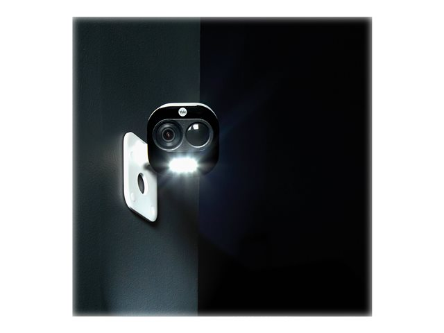 Discrète à l'intérieur et dissuasive à l'extérieur, la Caméra de porte d'entrée - Lumière et sirène est un système de sécurité résistant aux intempéries intégrant un projecteur lumineux et une sirène 80 dB. Visualisez votre maison de jour comme de nuit et personnalisez les paramètres de détection pour recevoir des alertes instantanées quand un mouvement est détecté.