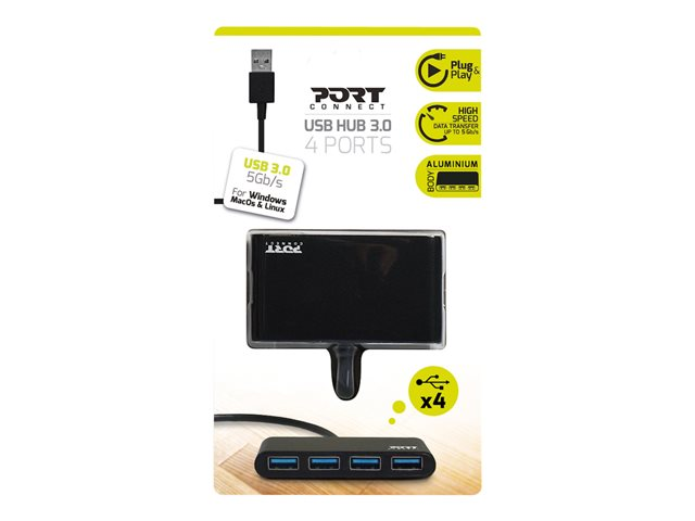 Description du produit PORT Connect - concentrateur (hub) - 4 ports Type de périphérique Concentrateur (hub) - 4 ports Sous-type USB Ports 4 x SuperSpeed USB 3.0 Performances Taux de transfert de données: 5 Gbps Normes de conformité USB 1.1, USB 2.0, USB 3.0 Dimensions (LxPxH) 7.7 cm x 4.3 cm x 1.2 cm Poids 54 g Couleur Gris Configuration requise Apple MacOS, Linux, Microsoft Windows Garantie du fabricant Garantie de 2 ans -