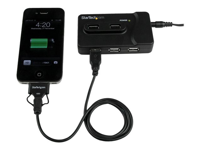 Ce hub comprend un adaptateur d'alimentation externe qui, une fois connecté, permet de charger certains appareils électroniques portables (p. ex., un iPhone ou un autre smartphone), même sans connexion USB à un ordinateur hôte.