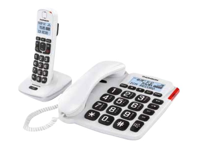 Description du produit Thomson Serea Comby - téléphone filaire - système de répondeur + combiné supplémentaire Type de Produit Téléphone filaire système de répondeur + combiné supplémentaire Nombre de combinés sans fil 1 Norme de transmission sans fil DECTGAP Mains libres Oui Affichage Écran LCD - monochrome - Oui Couleur du boîtier Blanc -